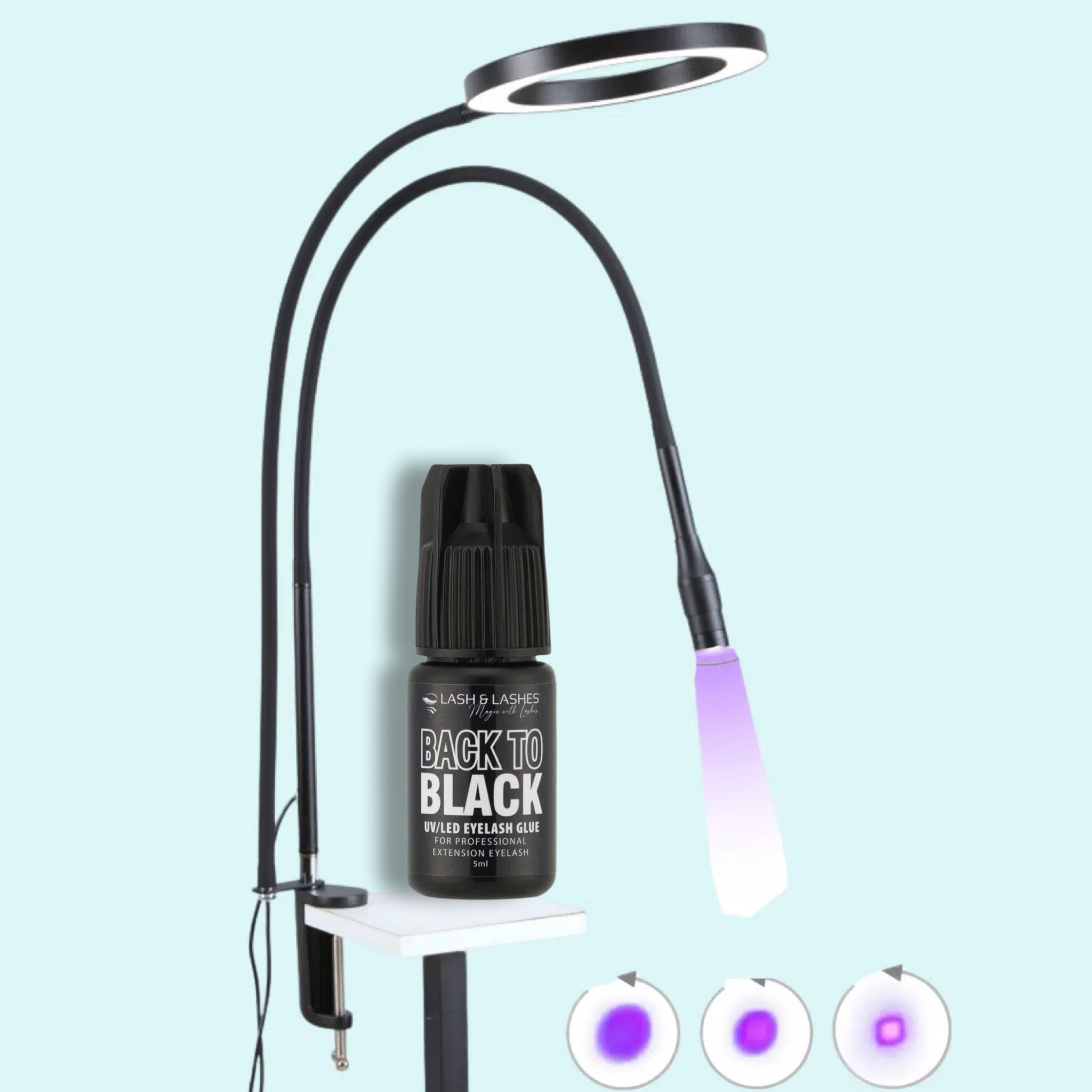 Asztalra Rögzíthető Duo UV / LED Lámpa Állítható Fényerővel és Fókusszal Szempillaragasztóhoz + Back-To Black UV/LED Fekete Szempillaragasztó